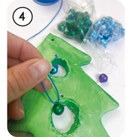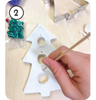Mit einem spitzen Stäbchen oder einem runden Ausstecher stechen wir drei Löcher in den Tannenbaum. Dann bohren wir kleine Löcher zum Aufhängen und zum Befestigen der Glöckchen.
